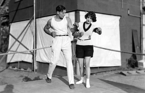 Jack Dempsey teaches his Wilmington bride, Estelle Taylor, a few boxing moves.